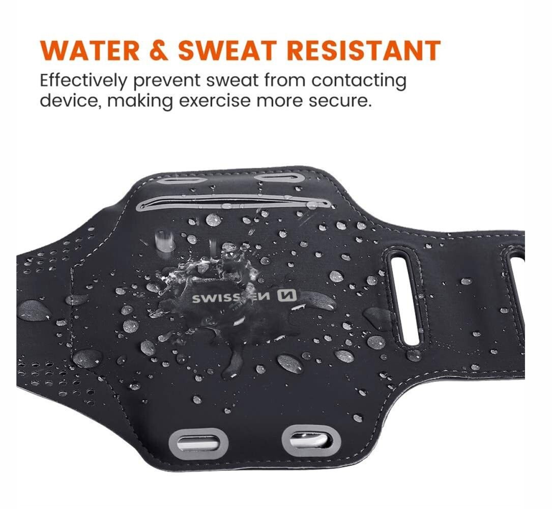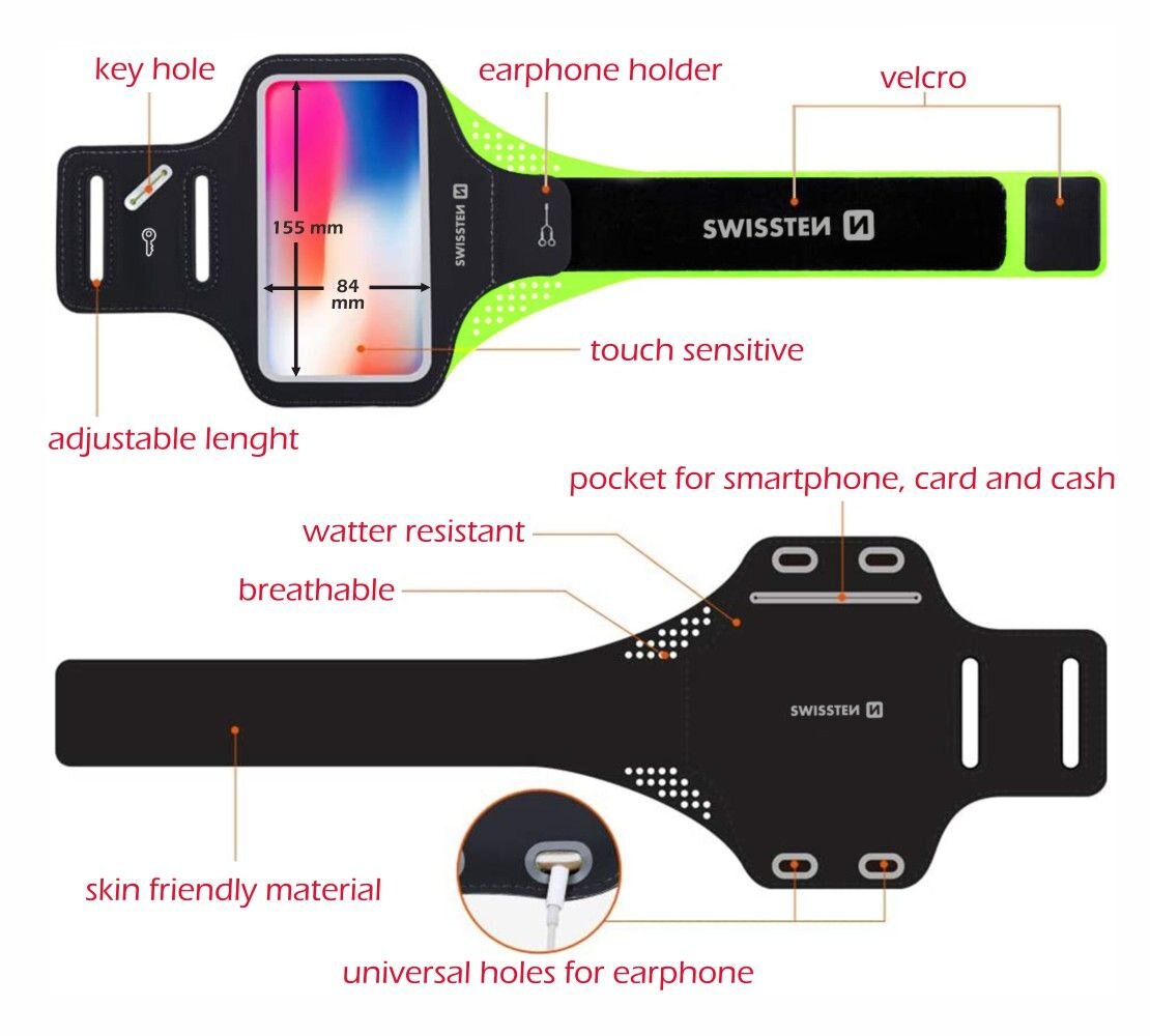 Die Sportarmband-Hülle ArmBed von SWISSTEN ist ein praktisches Zubehör für Läufer, Fitnessbegeisterte und andere aktive Nutzer, die ihr Smartphone immer bei sich tragen möchten. Die transparente Folie auf der Vorderseite ermöglicht die volle Bedienung des Displays, ohne das Gerät herauszunehmen. Ein verstellbares Band für Armumfänge bis zu 38 cm sorgt für einen sicheren und angenehmen Halt. Die Hülle ist mit reflektierenden Elementen für mehr Sicherheit und einem Kopfhörerausgang ausgestattet, sodass Sie auch während des Trainings Musik hören können. Hergestellt aus wasserabweisendem, angenehmem Material, das sowohl Schweiß als auch Regen standhält.