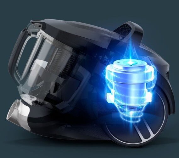 Der beutellose Staubsauger bietet eine hohe Leistung, eine 3-stufige HEPA-Filterung und einen großen 2,5-Liter-Staubbehälter in einem kompakten Gehäuse. Dank des umfangreichen Zubehörs und eines Aktionsradius von 8,8 m reinigt er zuverlässig Teppiche und Hartböden.