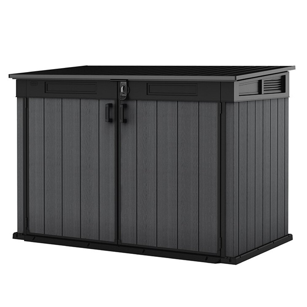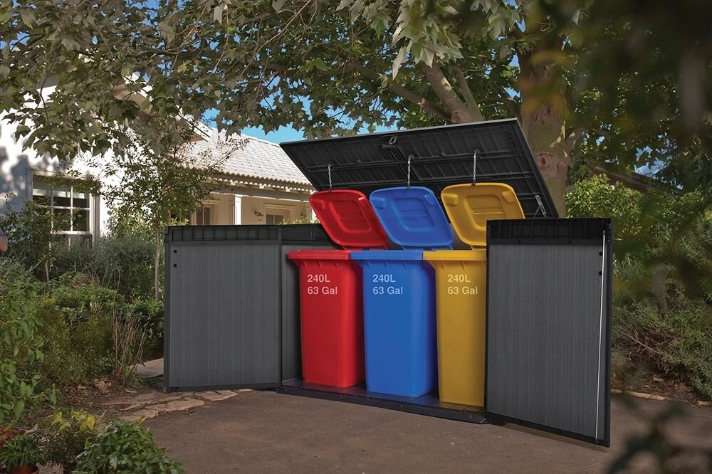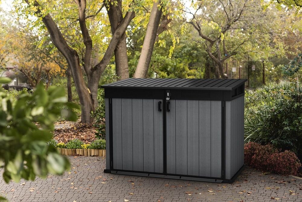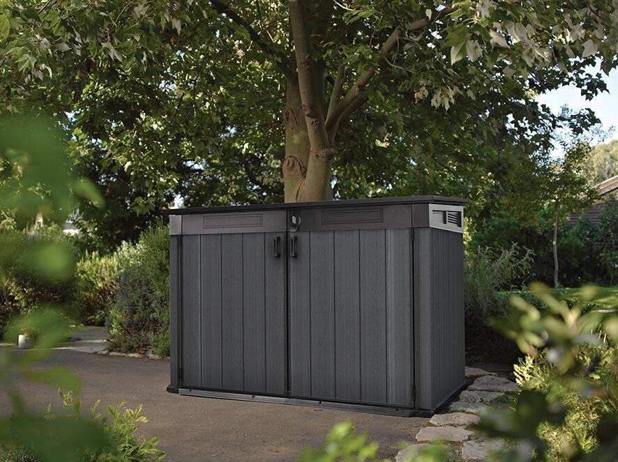Außerdem können Sie darin problemlos Grill, Kissen, Gießkannen, Blumentöpfe, Spielzeug und viele andere Dinge verstauen. Die ideale Wahl für die Aufbewahrung von Behältern. Der Schrank kann drei 240-Liter-Behälter aufnehmen, und es sind Ketten enthalten, damit sich die Deckel der Behälter zusammen mit dem Deckel des Schranks öffnen lassen. Außerdem ist eine Belüftung eingebaut, um Gerüche zu vermeiden. Ein weiterer großer Vorteil ist die Möglichkeit, Einlegeböden anzubringen - 2 Einlegeböden mit einer Tragfähigkeit von 16 kg sind im Lieferumfang enthalten, ebenso wie Schrauben und Haken zur Befestigung der Einlegeböden. Der Zugang zum Schrank wird durch eine schräge Schwelle, zweiflügelige Türen und einen aufklappbaren Deckel erleichtert. Das leichte Öffnen des Deckels wird durch Hydraulikkolben gewährleistet. Der Schrank zeichnet sich durch ein schlichtes und elegantes Design sowie durch eine an Holz erinnernde Oberflächenstruktur aus. Die sehr stabile Konstruktion, die verstärkten Wände und die Möglichkeit, die Doppeltüren mit einem Vorhängeschloss zu verschließen, sorgen für den Schutz der gelagerten Gegenstände. Der CORTINA MEGA Schrank ist witterungsbeständig. Die hochwertigen EVOTECH-Kunststoffmaterialien sorgen für eine jahrelange Haltbarkeit des Produkts. Der Schrank ist wartungsfrei, rostet nicht, blättert nicht ab.