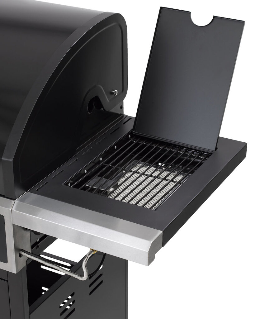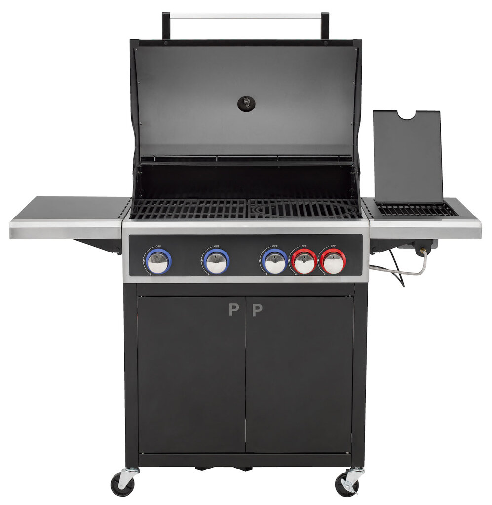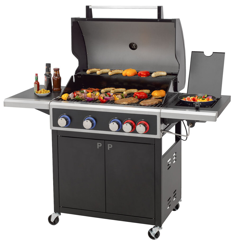 Vier-Brenner-Gasgrill, Leistung 18 kW, schwarz, Grillfläche 71 x 43 cm.