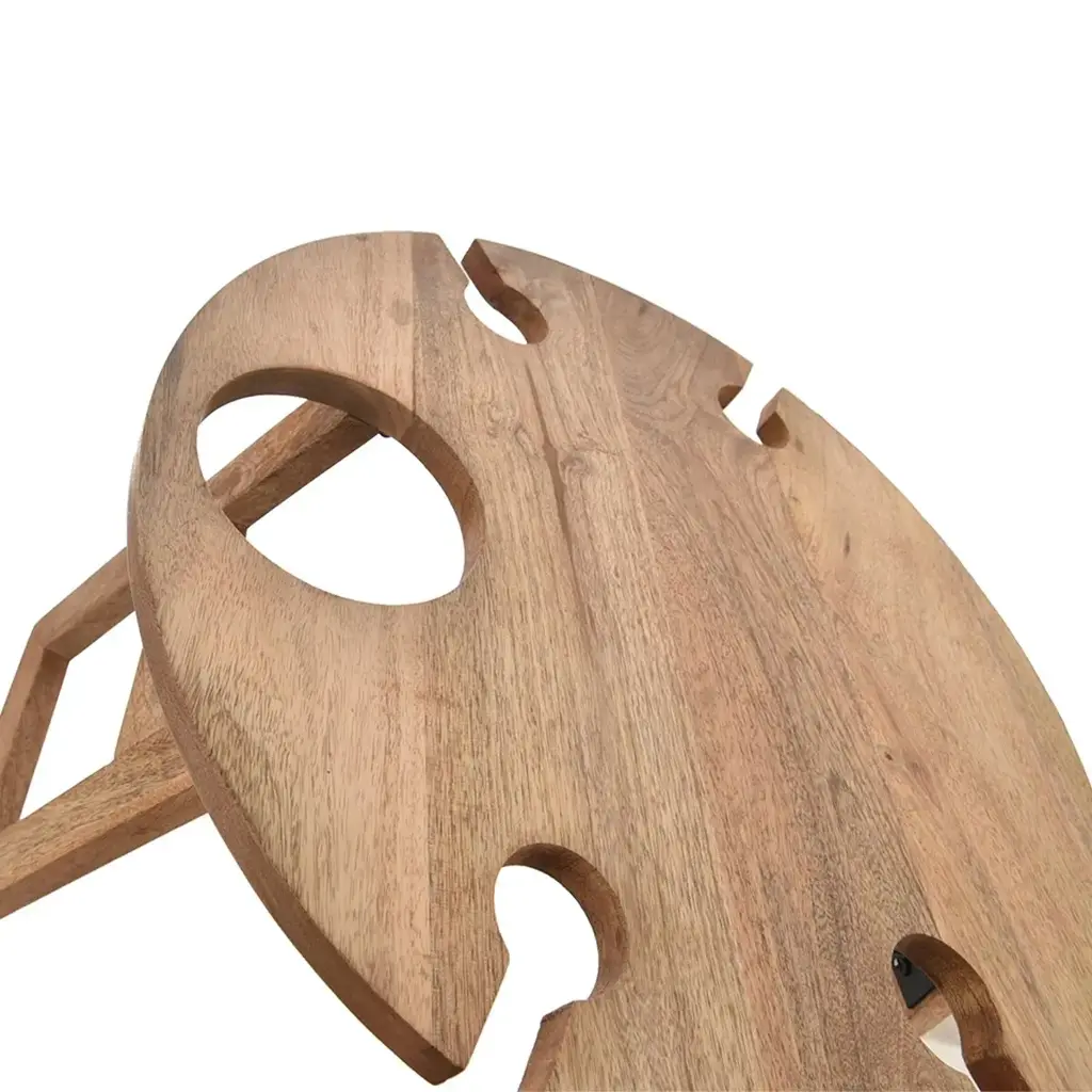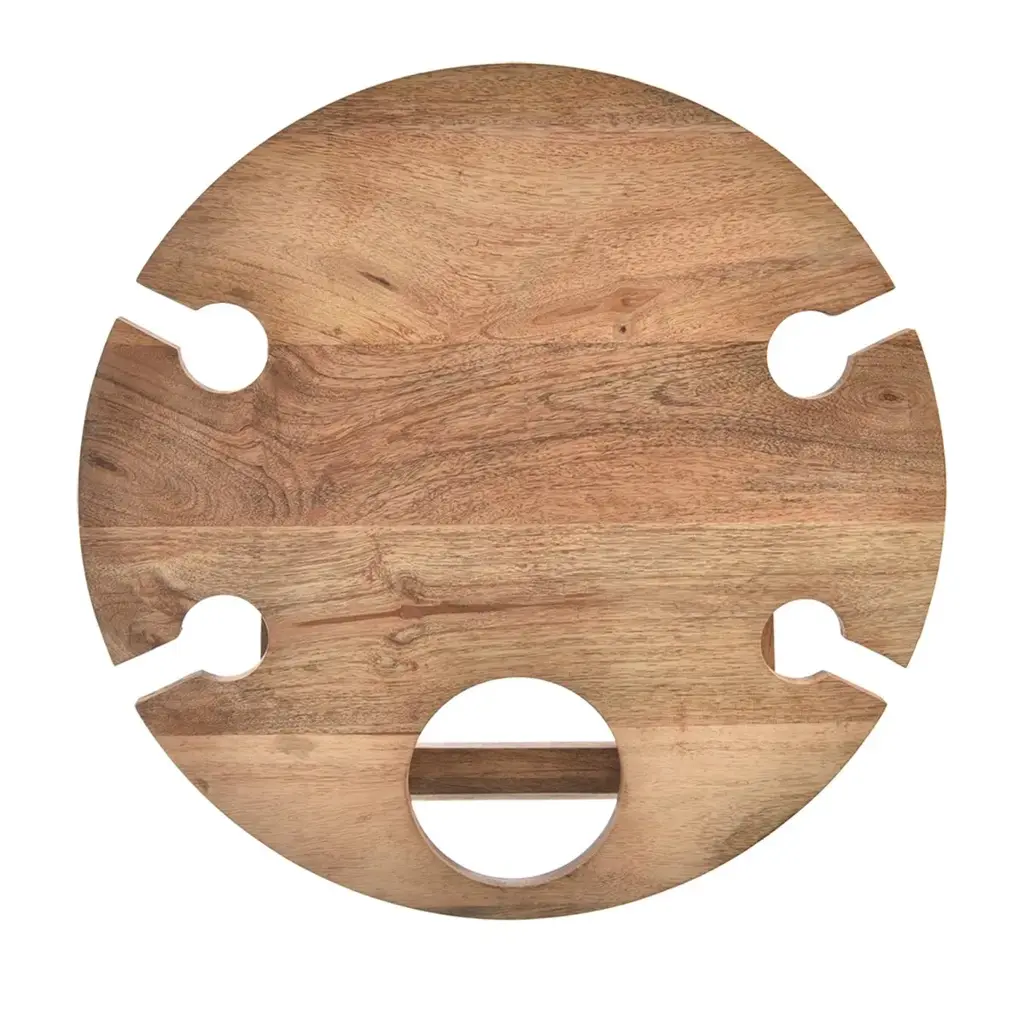 Stilvoller Picknicktisch mit einem Durchmesser von 39,5 cm und Öffnungen für Flaschen oder Gläser. Ein idealer Helfer für das bequeme Servieren von Wein und Köstlichkeiten beim Picknick oder zu Hause.