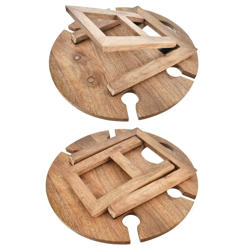 Der Picknicktablett-Tisch mit einem Durchmesser von 39,5 cm ist die ideale Wahl für stilvolles Servieren im Garten, beim Picknick, auf der Terrasse oder am Bett. Er ist aus hochwertigem Mangoholz gefertigt, das nicht nur robust, sondern auch elegant mit einer natürlichen Maserung ist. Die Öffnung in der Tischplatte ermöglicht das Einsetzen von Flaschen oder Gläsern, was maximalen Komfort beim Servieren von Getränken bietet. Nach dem Aufstellen bietet der Tisch massive Beine, die Stabilität auf jeder Oberfläche gewährleisten. Die praktische Höhe von 24,5 cm ist ideal für komfortables Servieren. Dank seiner klappbaren Konstruktion lässt sich der Tisch einfach verstauen und misst im zusammengeklappten Zustand nur 3,8 cm in der Höhe. Die Pflege ist einfach – wischen Sie den Tisch mit einem feuchten Tuch ab und pflegen Sie ihn gelegentlich mit Speiseöl, um die Holzmaserung zu betonen.