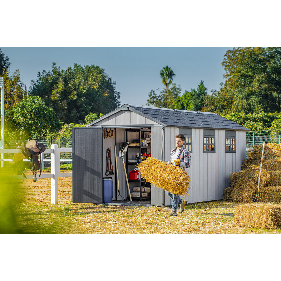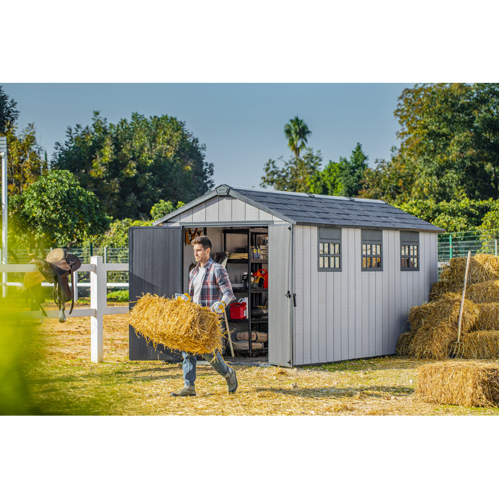 Das Kunststoff-Gartenhaus Oakland ist nicht nur ideal für die Aufbewahrung von Werkzeugen und Gartenzubehör, sondern auch für einen Rasenmäher oder einen Grill.