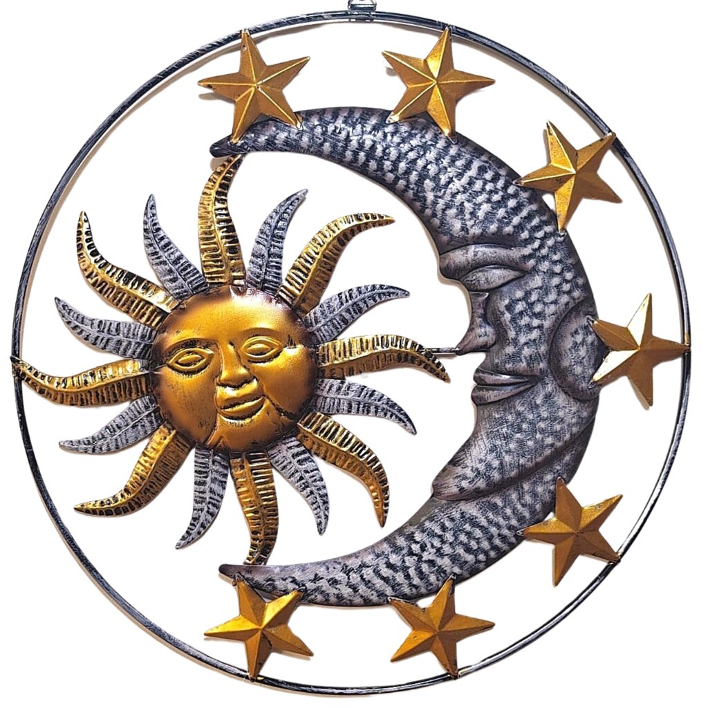 Diese Metalldekoration symbolisiert die Harmonie zwischen Licht und Dunkelheit, Tag und Nacht. Die Sonne steht für Kraft und Energie, während der Mond und die Sterne Ruhe und Harmonie verleihen. Dank der präzisen Metallverarbeitung eignet sie sich sowohl für Innen- als auch für Außenbereiche. Neben dieser großen Version bieten wir auch zwei kleinere Varianten mit Durchmessern von 29 cm und 45 cm an.