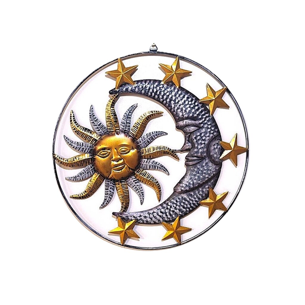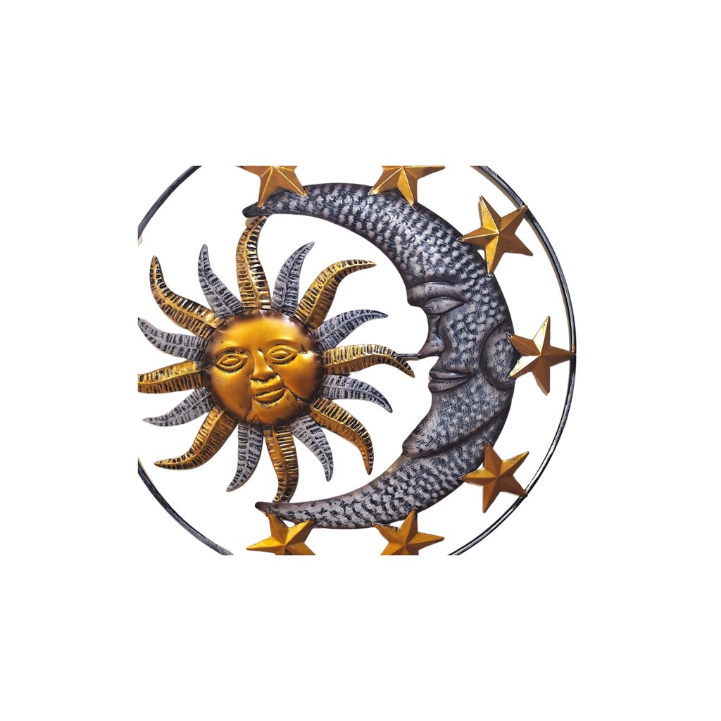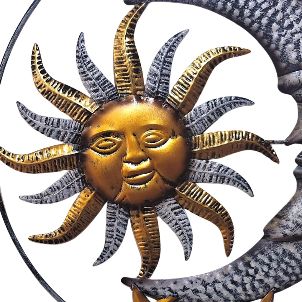 Die Sonne mit Mond und Sternen (ø 29 cm) symbolisiert das Gleichgewicht zwischen Licht und Dunkelheit, Tag und Nacht. Die Sonne steht für Kraft und Energie, während der Mond und die Sterne Ruhe und Harmonie verleihen. Dieses kleinere Modell ist ideal für den Innen- und Außenbereich, und wenn Sie eine größere Variante suchen, bieten wir noch zwei größere Versionen dieser Dekoration an.