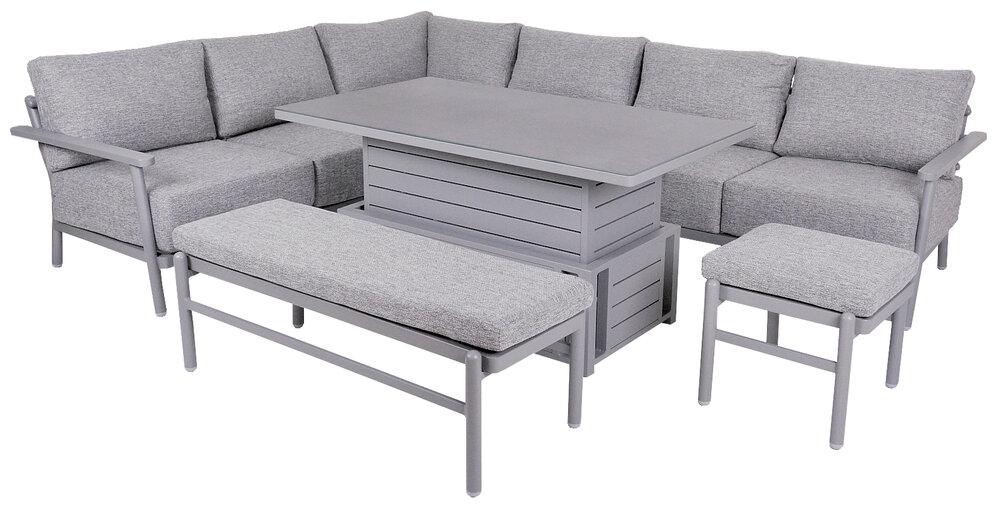 Das luxuriöse Aluminium-Set Tampa vereint modernes Design mit maximalem Komfort. Dank des höhenverstellbaren Tisches mit einer keramischen Glasplatte ist es ideal für Gärten, Terrassen, Wintergärten und Innenräume.