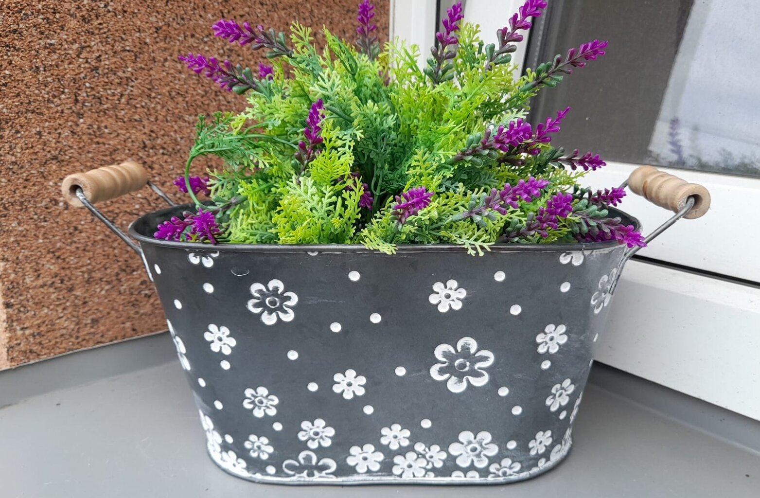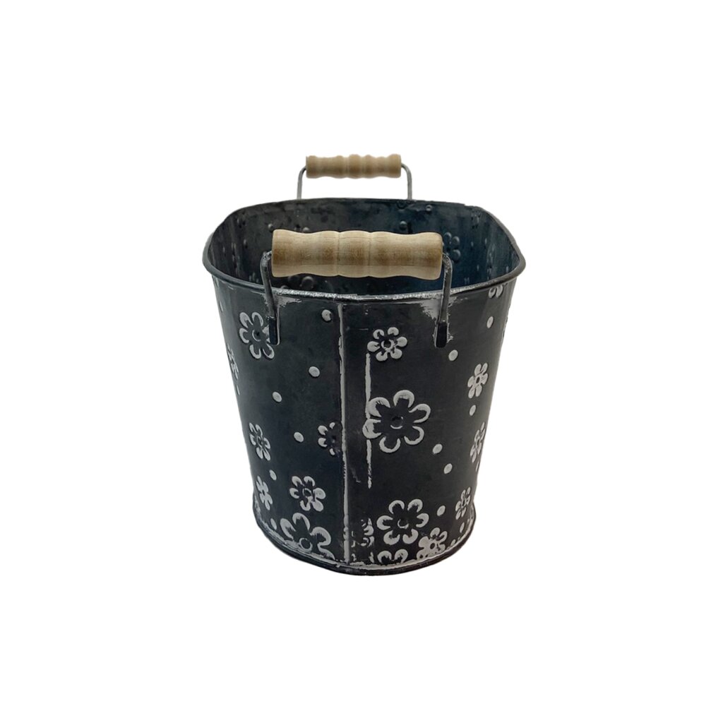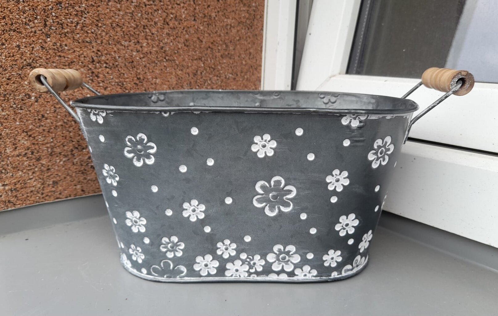 Geschmackvoller Übertopf mit zarten Blumen, für drinnen und draußen geeignet, aus langlebigem Zink.